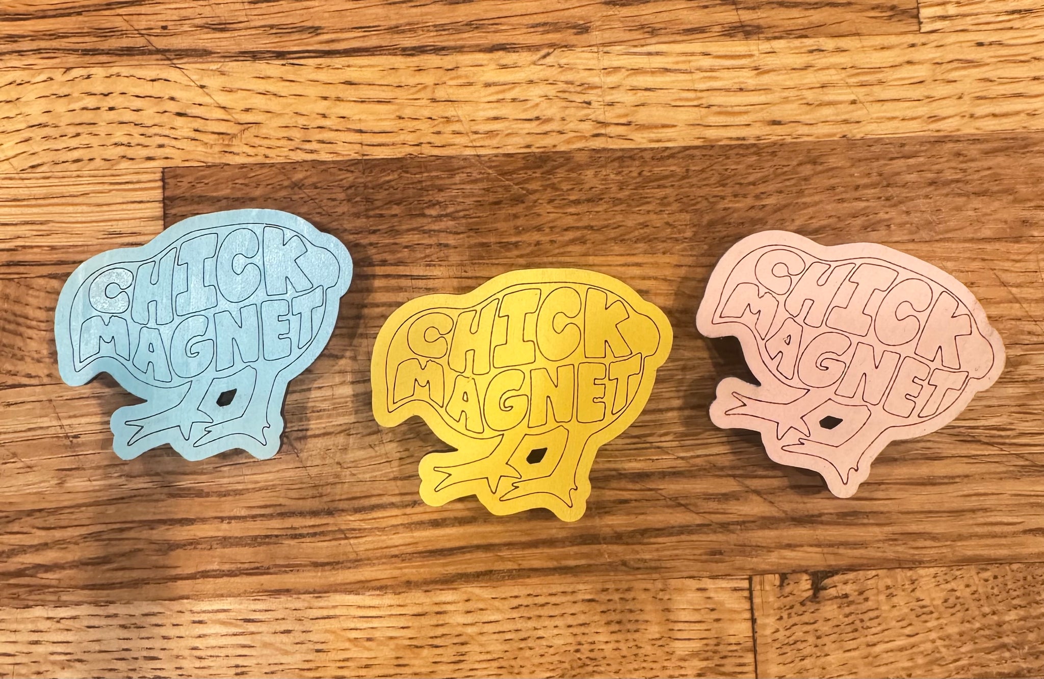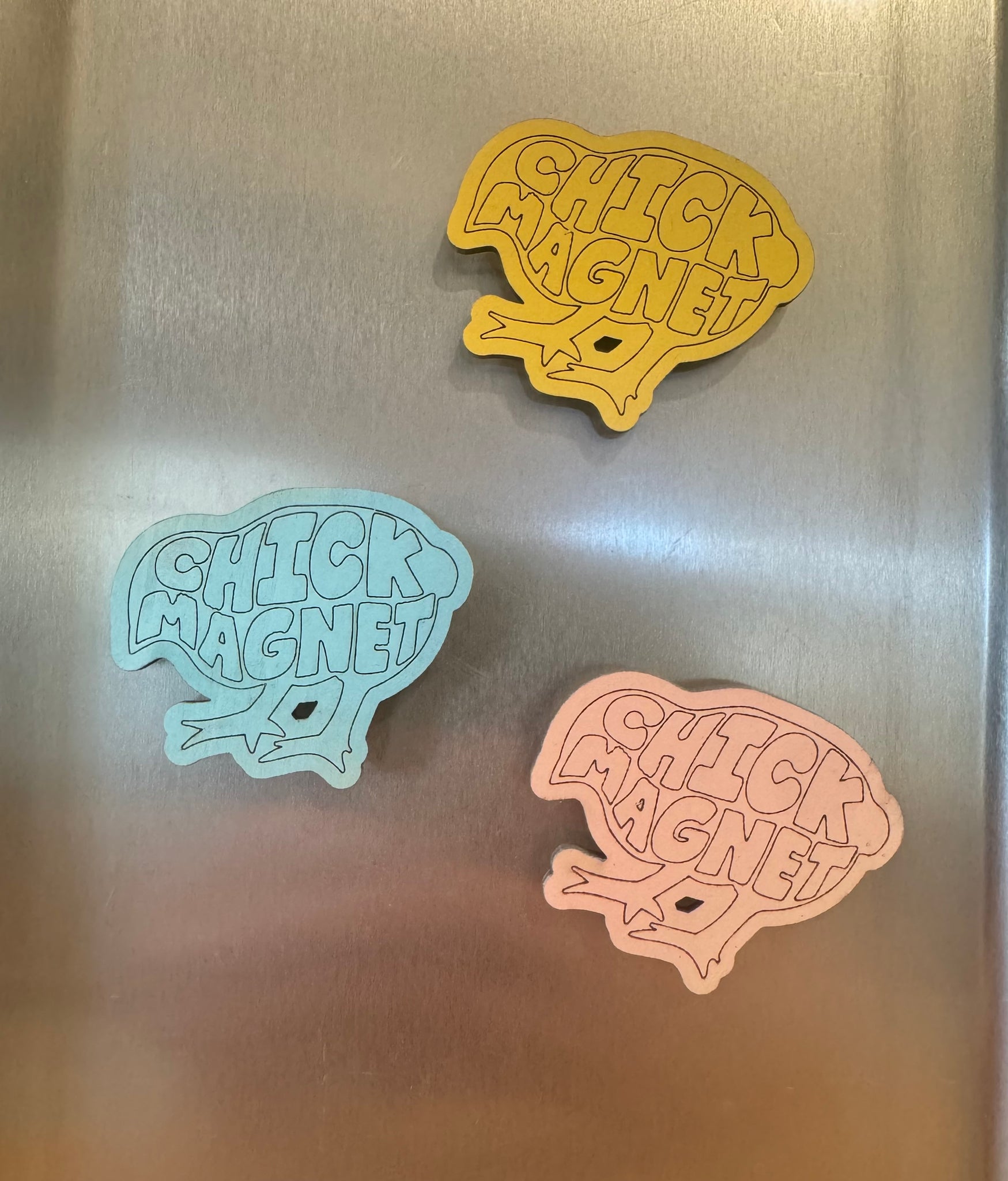 Add a little fun to your space with this charming set of three Chick magnets. Each chick is laser-cut in our studio using our laser machine, creating crisp details and a modern layered look. Made with a mix of spring colors, these magnets bring a cheerful, nature-inspired touch to your fridge, office, or magnetic board.
