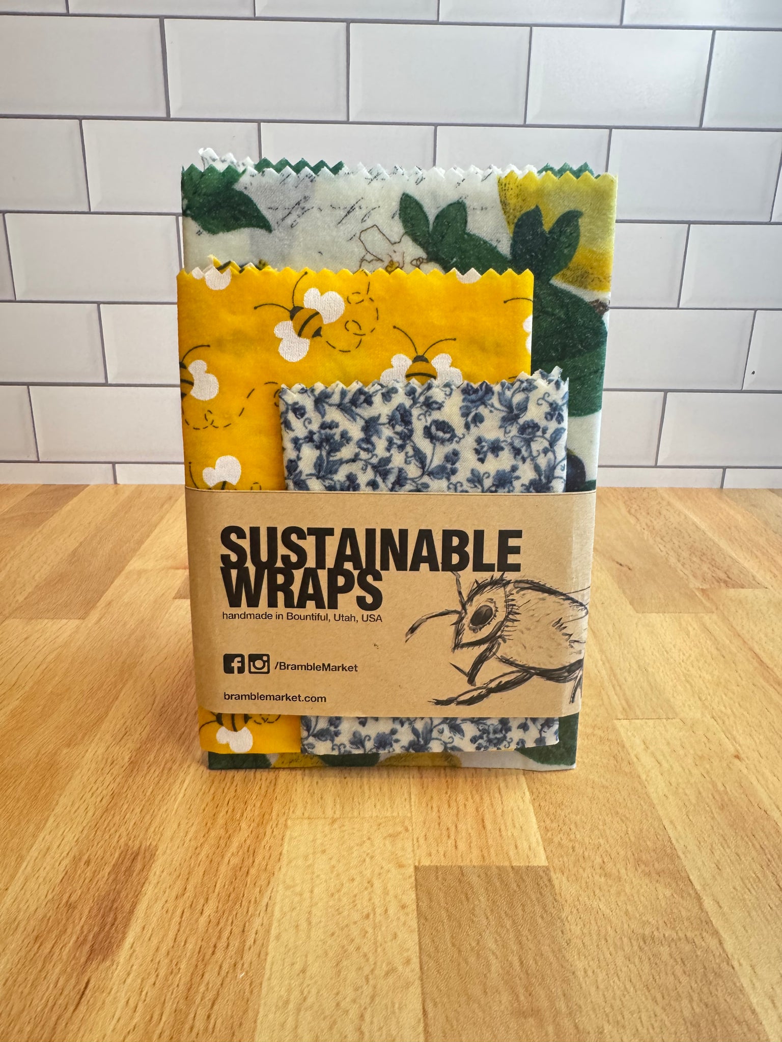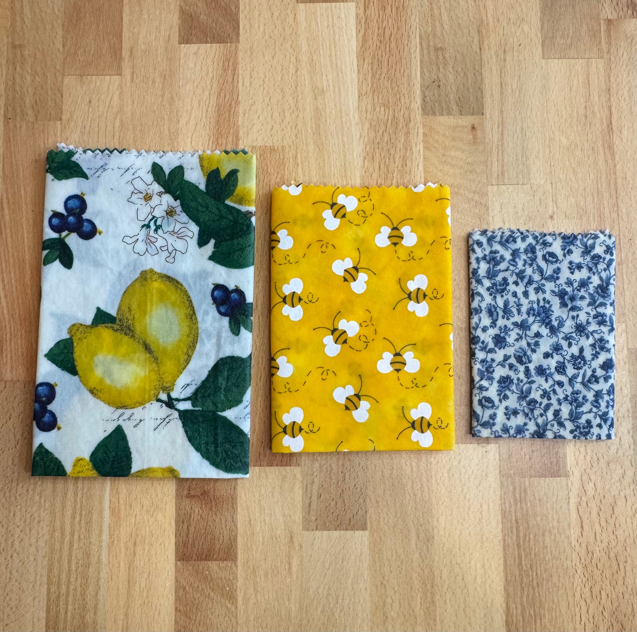 Blueberry Set. We love our wraps, each one is handmade in our workshop. Sustainable Wraps are easy to use and ideal to wrap your sandwich, cover your bowl of leftovers or wrap your fruit, cheese and veggies. An Eco-Friendly alternative to plastic wrap and baggies. These wraps are good for the Planet as well as fun and colorful to store your food. The perfect gift for the person who has everything! ---------------------------------------------------------------------------------------------------------------------------------------------------- 🍃This set includes: 1 Small- Sustainable Beeswax Wraps 1 Medium -Sustainable Beeswax Wraps 1 Large- Sustainable Beeswax Wraps 🍃Size: approx. Small wrap- 9 Inches x 9 Inches Medium Wrap- 11 inches X 11 Inches Large Wrap- 14 inches x 14 inches 🍃Materials: 100% cotton fabric, beeswax, pine resin, and coconut oil. 🍃To use: Simply place the wrap over your food or dish and with the warmth and pressure of your hands shape the wrap to seal your food. Suitable for vegetables, cheeses, sandwiches, breads and snacks: Not for raw meat, hot dishes or liquids. 🍃Care: To look after, you simply wipe off in cool water, with mild detergent. Reuse up to 12 months, when they no longer stick, simply compost. ------------------------------------------------------------------------------------------------------------------------🍃Follow us & see what's new- Instagram: bramblemarket